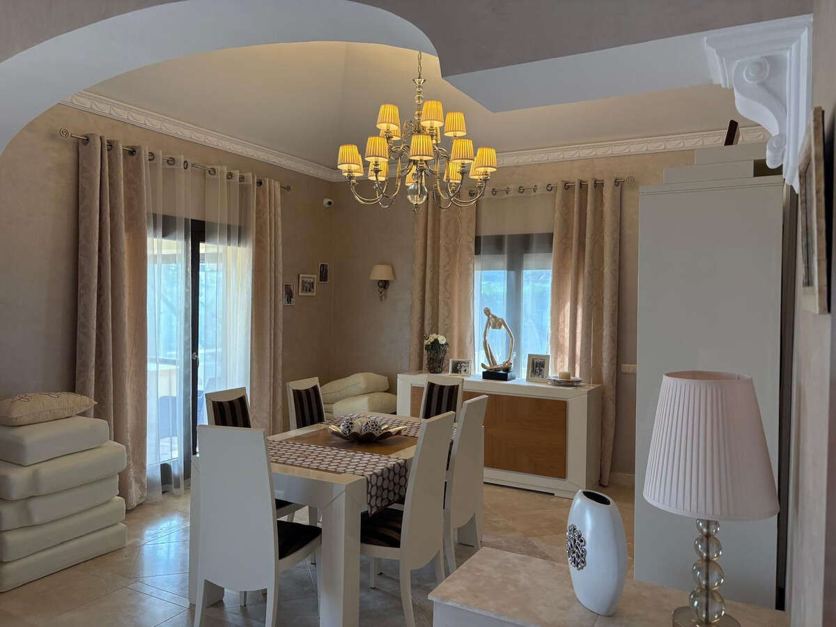 The entrance leads to a cozy foyer, which opens up to a spacious living room. To the right, there is a dining area with access to the modern kitchen, and to the left, there is a relaxation area with a fireplace room, a comfortable sofa, and a television. From the living room, you can step out onto a large, enclosed terrace with stunning views of the golf course, the sea, as well as the private garden and pool. Thanks to the southern orientation, the house is filled with sunlight throughout the day.