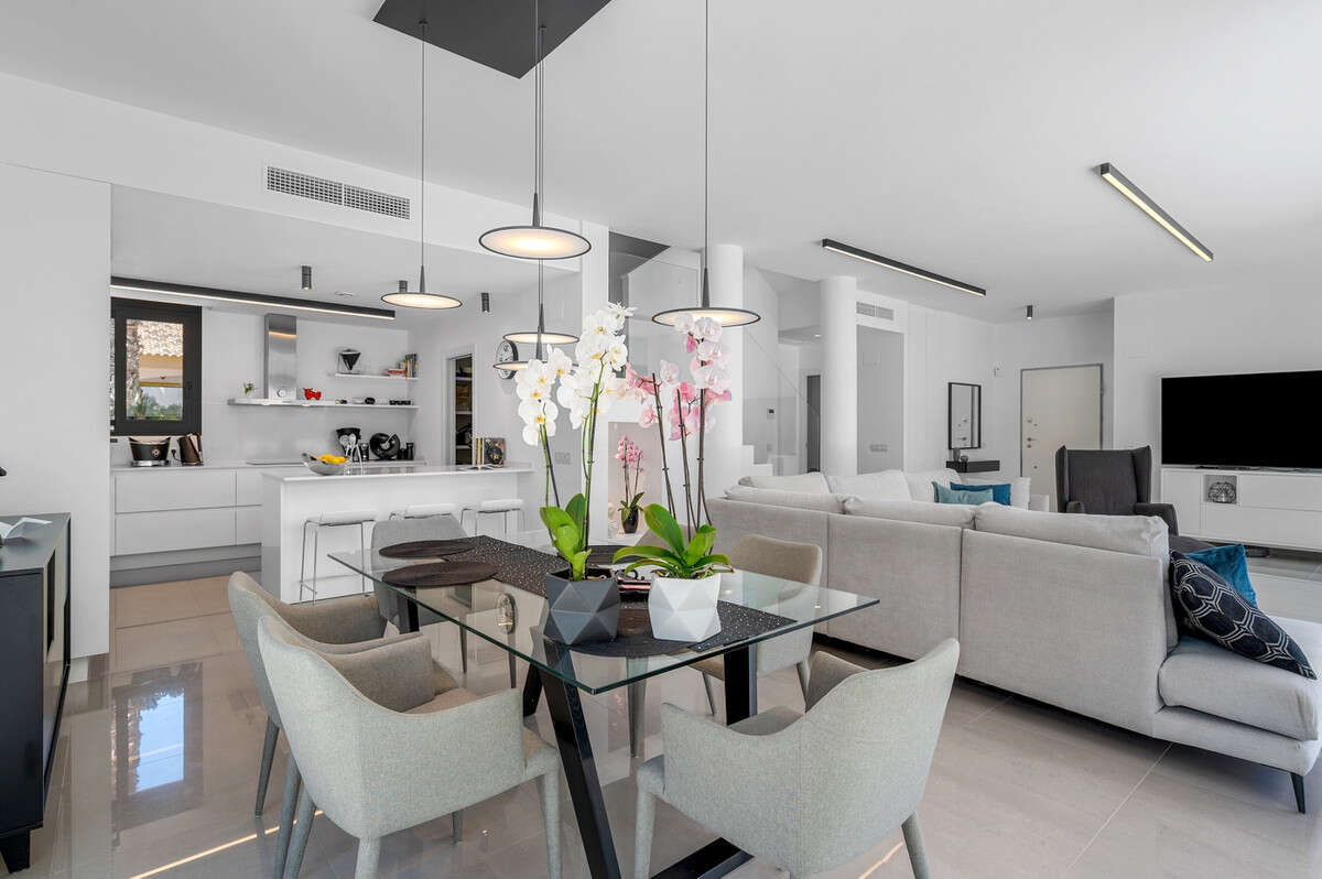 Situated on a 347m² plot, this contemporary villa—built in 2019—offers a refined blend of modern architecture and comfortable living. Spanning 194m² across three levels, the home features four generously sized bedrooms and three bathrooms, with a layout designed for both privacy and functionality. The open-plan kitchen flows into the dining and living areas, creating a bright, spacious environment with direct access to the garden and terrace through large sliding glass doors, inviting natural light throughout the day.