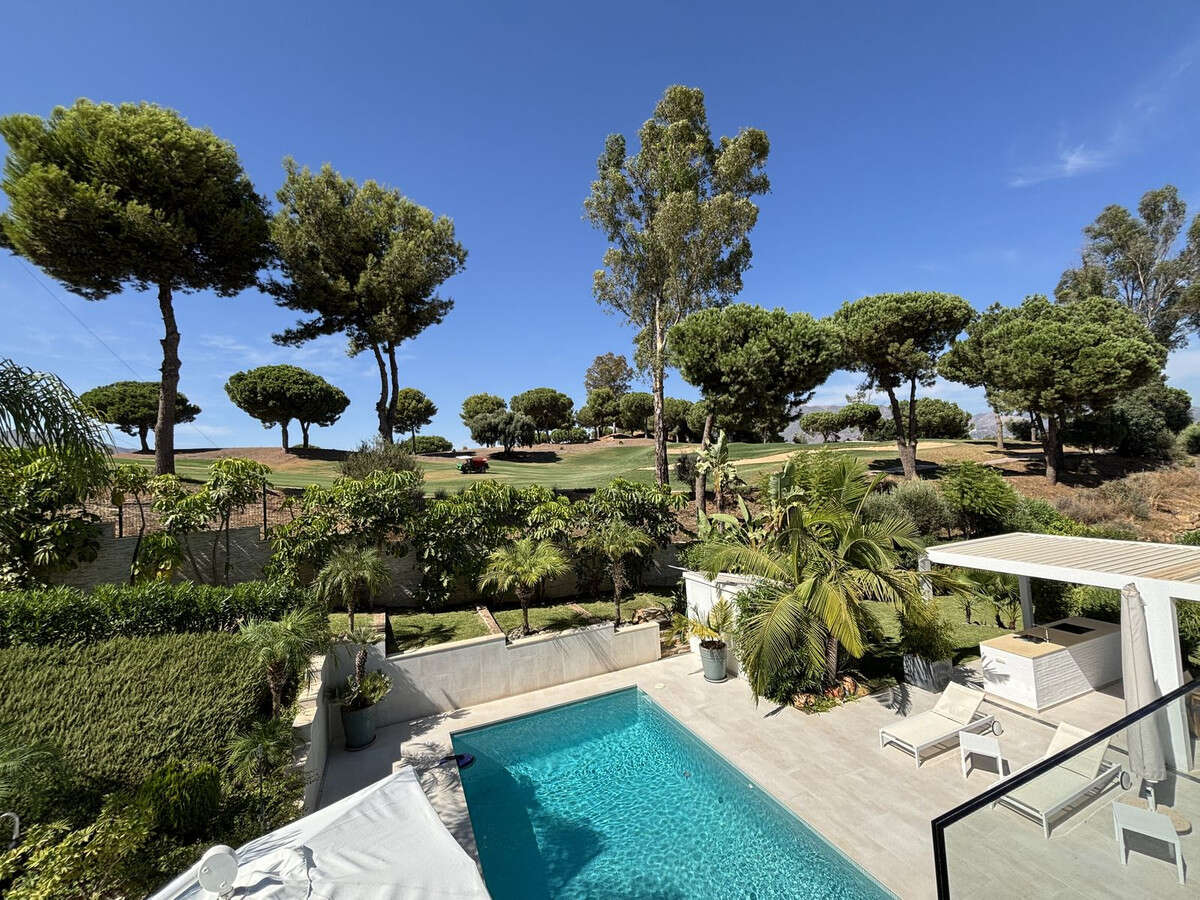 The open-plan living area connects to a modern kitchen and opens out to sunny terraces, a landscaped garden, and a private pool. On the rooftop, a large terrace provides panoramic views of the golf course and surrounding landscape — perfect for relaxing or entertaining.