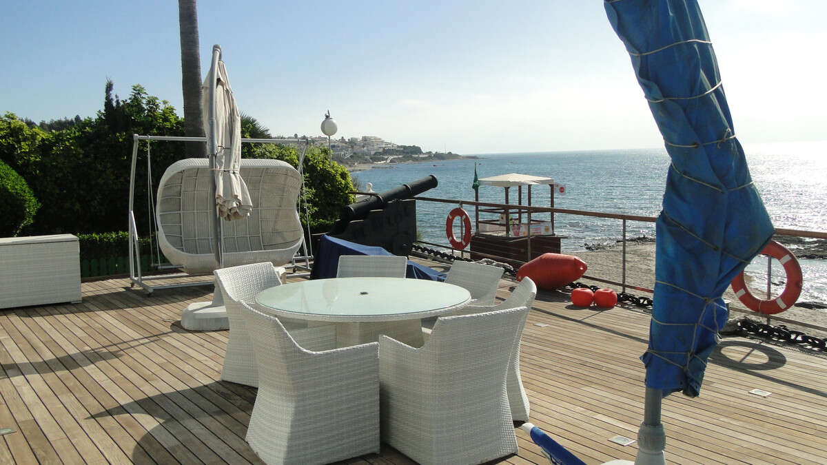 AN IMPRESSIVE, UNIQUE AND ORIGINAL VILLA WHICH IS TOTALLY FRONT-LINE BEACH IN EL CHAPARRAL WITH PRIVATE DIRECT ACCESS TO THE BEACH. IT HAS BEEN DESIGNED TO REPLICATE A BOAT WITH THE RESULTING SENSATION THAT YOU ARE LITERALLY NAVIGATING THE OCEAN FROM ANY TERRACE OR WHEN LOOKING OUT TO SEA. IT CONSISTS OF 6 BEDROOMS EACH WITH ITS OWN EN-SUITE BATHROOM AND INDIVIDUAL DECOR. THE MASTER SUITE IS ON THE SECOND FLOOR AND HAS A HUGE PRIVATE TERRACE. SOME OF THE MANY FEATURES ARE: HEATED POOL, UNDER FLOOR HEATING, CENTRALISED AIR CONDITIONING, FIREPLACE, HIGH QUALITY KITCHEN, BRAZILIAN MARBLE FLOORING, PARKING FOR AT LEAST 12 CARS, GARAGE AND WORKSHOP. THE GUEST APARTMENT IS ACTUALLY A REAL BOAT WITH TWO BEDS, SMALL KITCHEN AND BATHROOM. SOMETHING TRULY ORIGINAL. EVERY DETAIL OF THE HOUSE HAS BEEN CAREFULLY CHOSEN TO REFLECT AND REMIND YOU OF THE MARINE WORLD. THERE IS NO OTHER VILLA LIKE THIS ON THE COSTA DEL SOL FOR IT´S INDIVIDUALITY AND AMAZING SENSE OF STYLE!