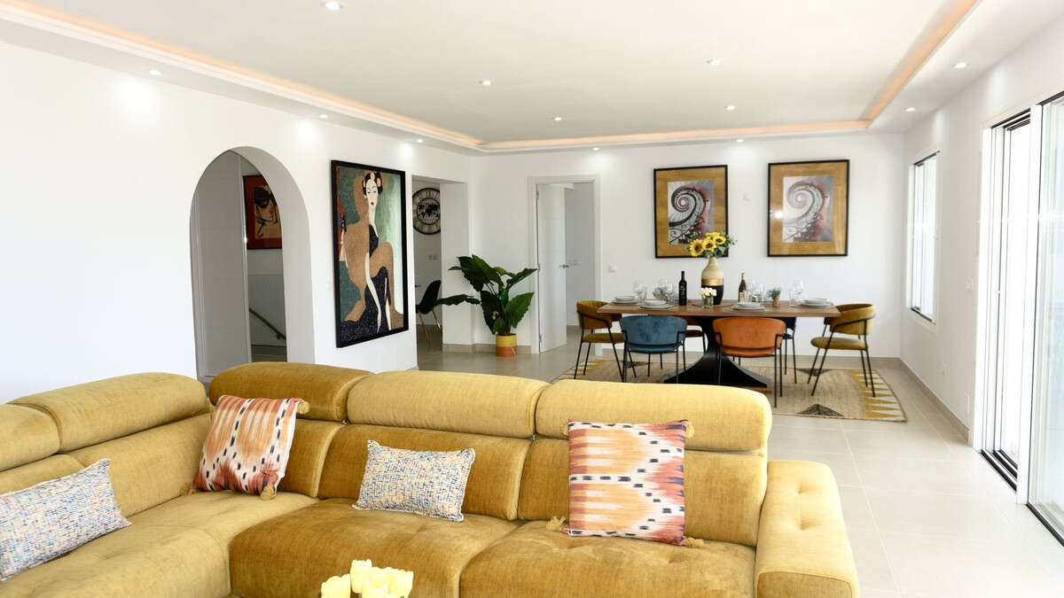 Open-plan living and dining room with sea views and direct access to the main terrace