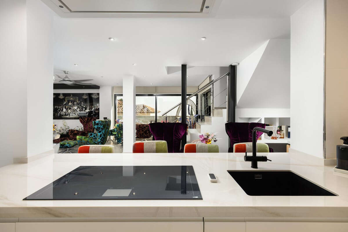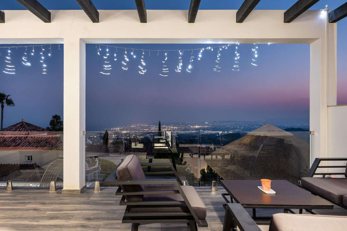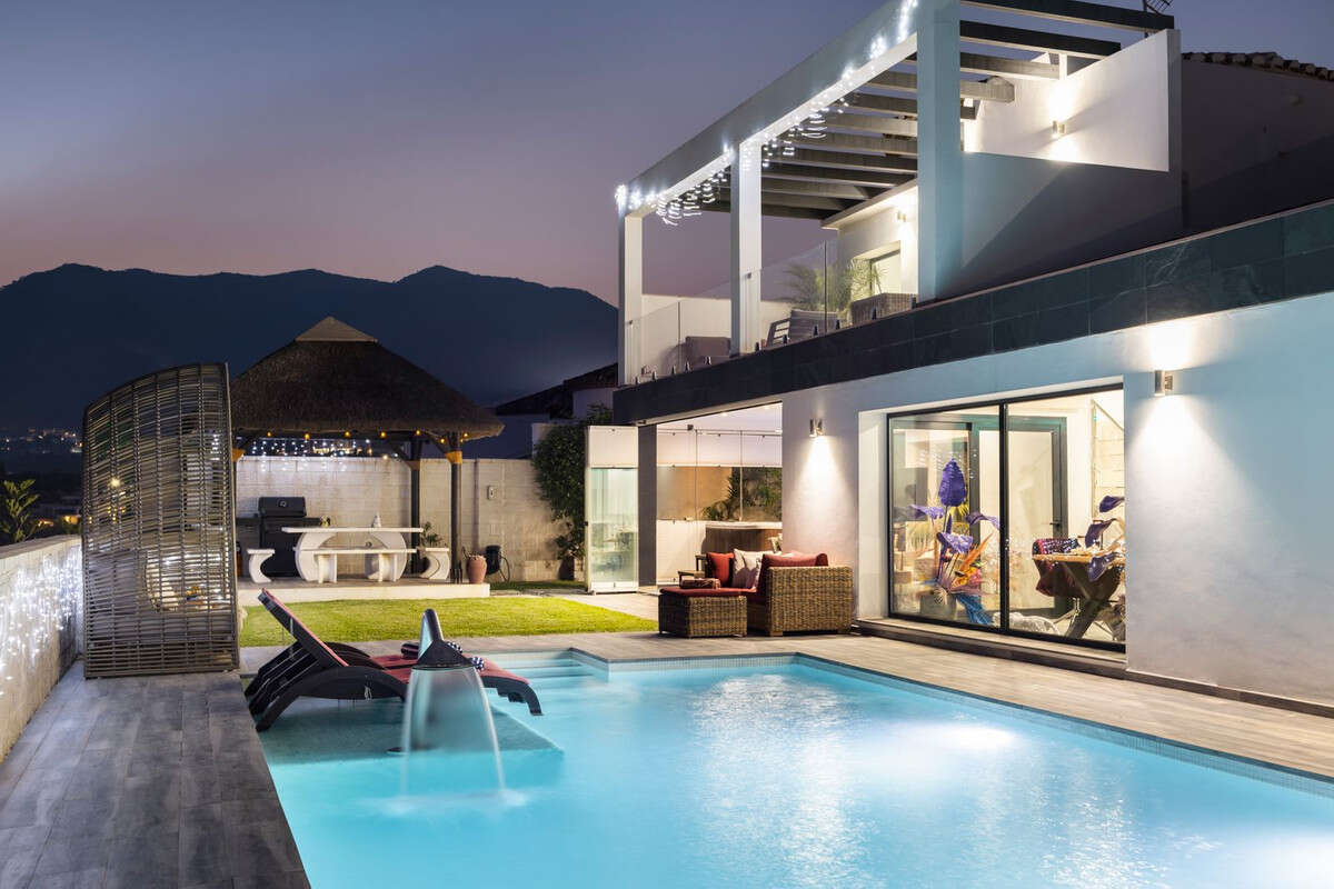 Spectacular villa that perfectly blends Mediterranean style with contemporary design, combining traditional charm with modern comfort and top-quality finishes. Located in the prestigious Buena Vista area of Mijas, it offers a unique lifestyle in a peaceful and private setting, with stunning panoramic views of the Mediterranean Sea, the coastline, Africa, and the mountains. Set on a plot of 800 m² with a built area of 251 m², the property is in immaculate condition and ready to move into. Its location is unbeatable: just 5 minutes from Fuengirola, 2 minutes from the exclusive Higuerón commercial area with all kinds of services, 10 minutes from the finest beaches of the Costa del Sol, and only 20 minutes from Málaga city center and the airport. The villa is mainly distributed on one floor, ensuring functionality and comfort. Upon entering, the home immediately stands out for its brightness and sense of space thanks to the open-plan design. The modern fully fitted kitchen seamlessly integrates with the spacious living room with fireplace, creating a warm atmosphere that connects with the terraces and garden through large sliding doors. The exterior is a true private retreat, featuring a swimming pool with sunbathing area and hydromassage jet, a barbecue area ideal for outdoor gatherings, and a landscaped garden with fruit trees, all with open views to the sea and mountains. The property offers four bedrooms. The master bedroom, with en-suite bathroom and walk-in wardrobe, has direct access to a terrace with a private jacuzzi. Two additional bedrooms with their own bathrooms are located on the opposite wing of the house, ensuring privacy for family or guests. On the upper floor, a versatile space currently used as a gym with bathroom and private terrace can easily be converted into an independent suite with spectacular views. Additional features include a cinema room, sauna, laundry room, air conditioning, solar panels for hot water, and parking space for three vehicles, including a closed garage and covered carport. An ideal residence both for year-round living and as a luxury holiday home, perfect for those seeking privacy, comfort, and a strategic location on the Costa del Sol.