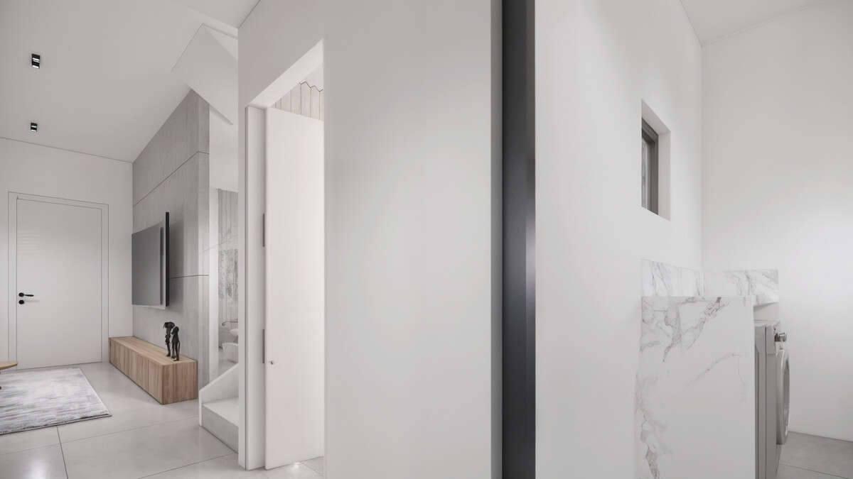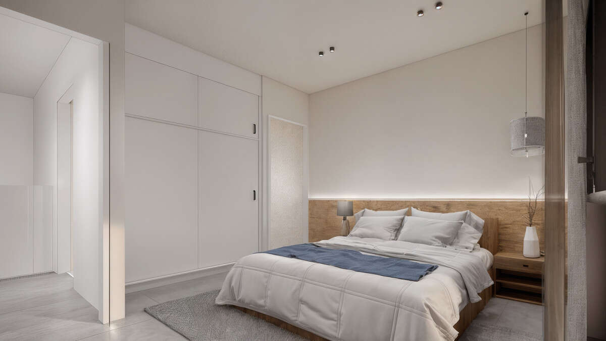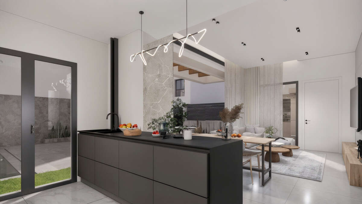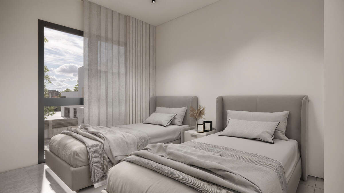 Each villa offers 110 m² of living space, spread over two floors, designed to maximize natural light and generous outdoor spaces with a private pool, ideal for relaxing or entertaining. The ground floor comprises an open-plan living area with an integrated kitchen, a bedroom, bathroom, and laundry room, while the upper floor offers two en-suite bedrooms and access to a private terrace.