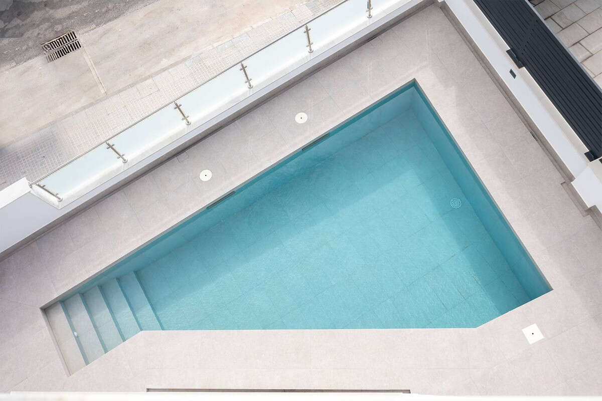 Outside, the villa includes a private pool and a parking area within the plot.