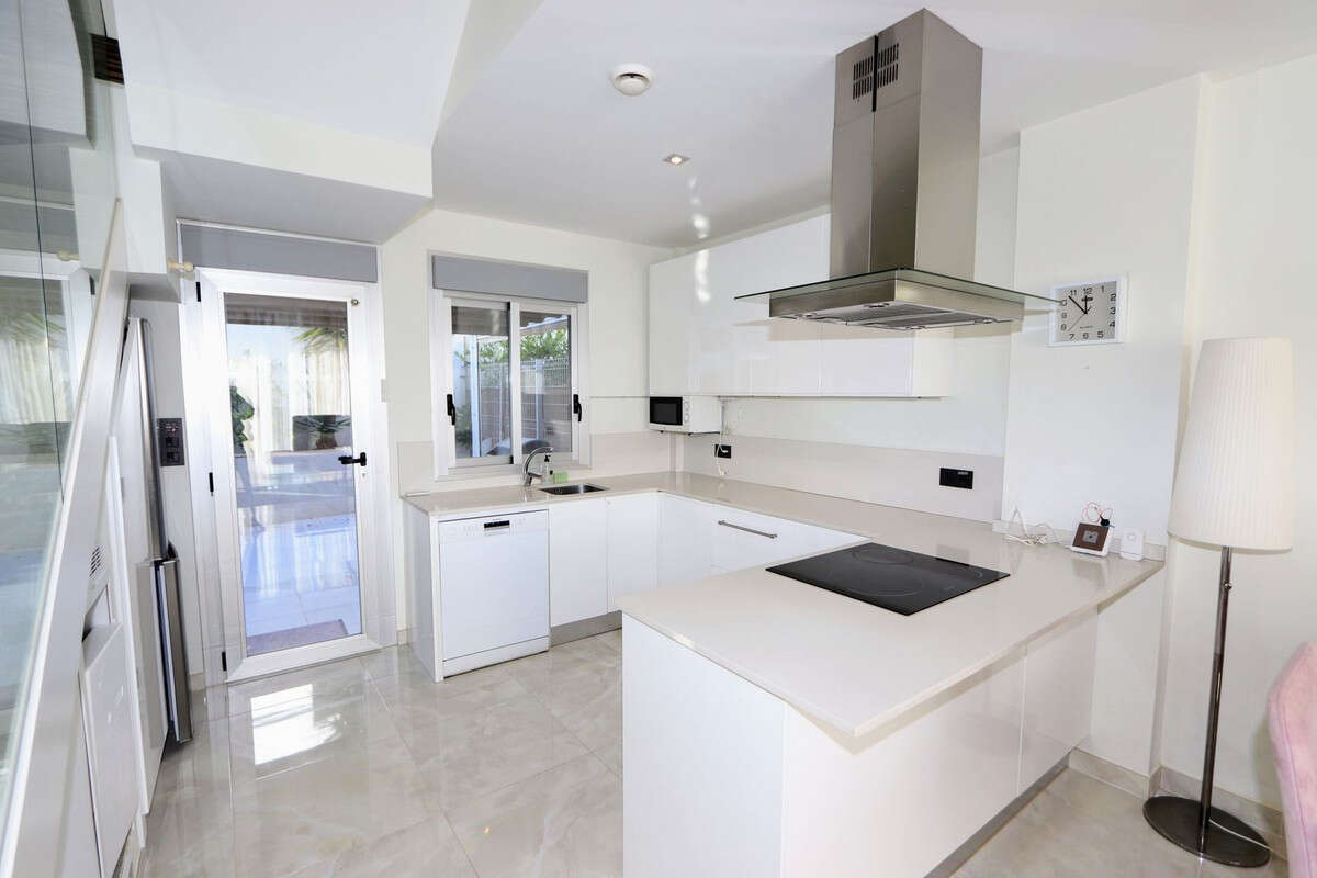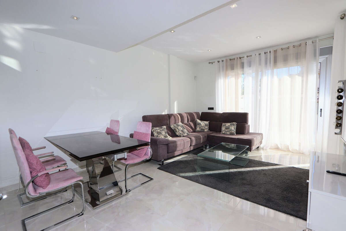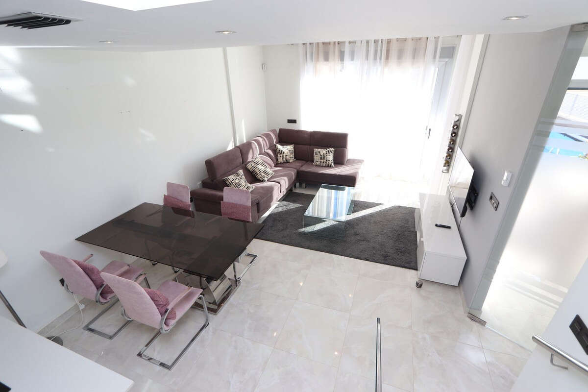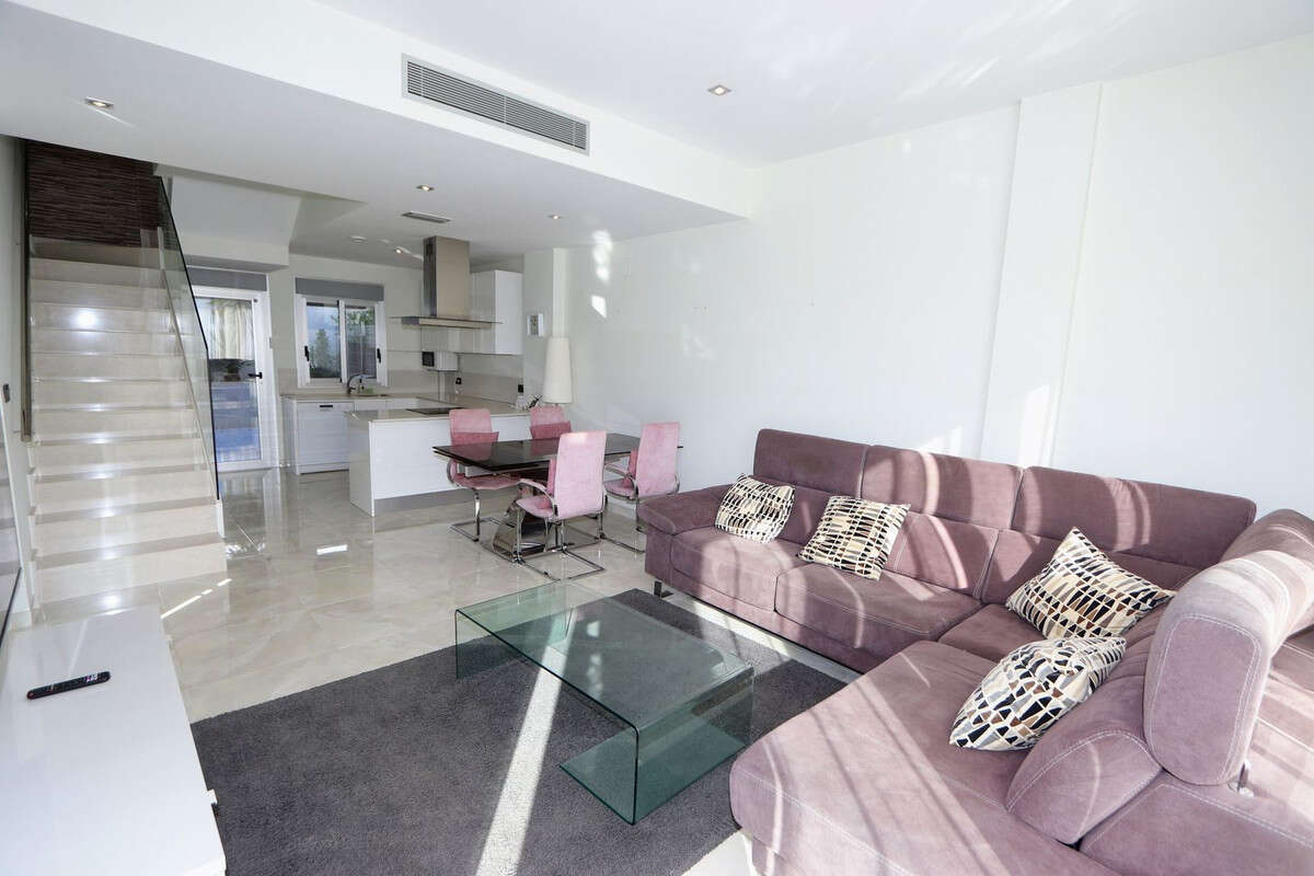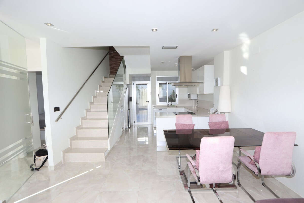 This newly built resale property features three bedrooms with fitted wardrobes, three bathrooms, a spacious living/dining area, and a fully fitted kitchen. Additional benefits include air conditioning, private terraced areas to the front and back, off-road parking, underfloor heating in living area and bathrooms, electric blinds, and solar panels for electric. The property benefits also from a private swimming pool.