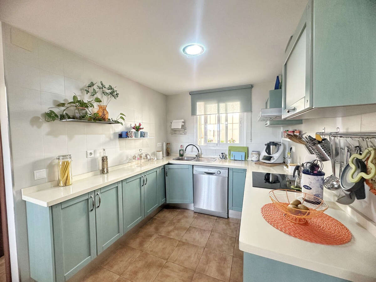 The fully fitted kitchen includes a spacious dining area, a laundry area, and direct access to a terrace with a barbecue area and pergola for enjoying time with family.