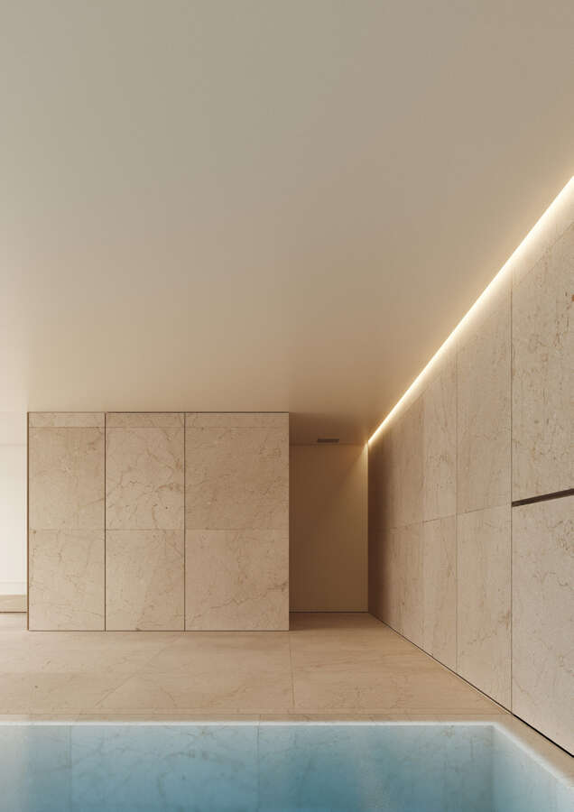 The basement of this villa features a heated indoor swimming pool, illuminated by sophisticated LED lighting, providing a warm and inviting space for relaxation, no matter the season.