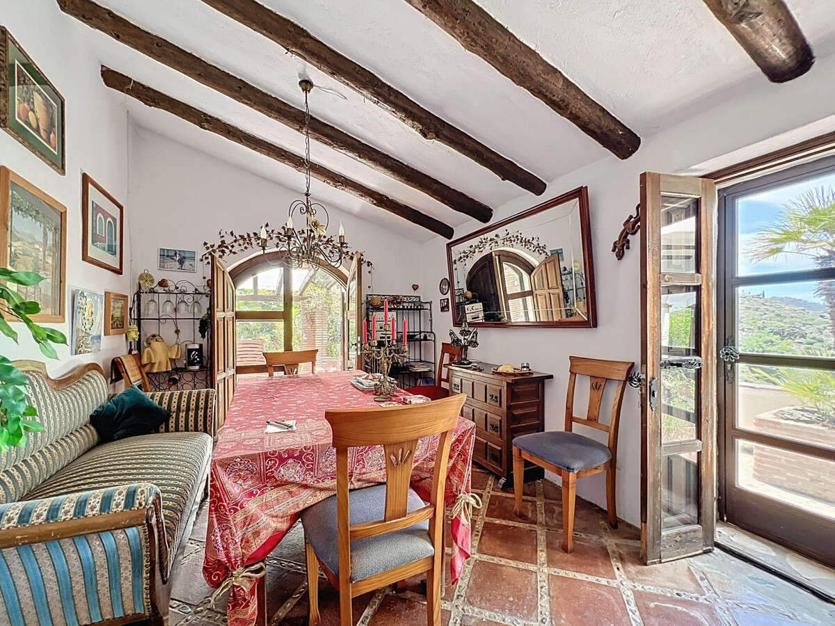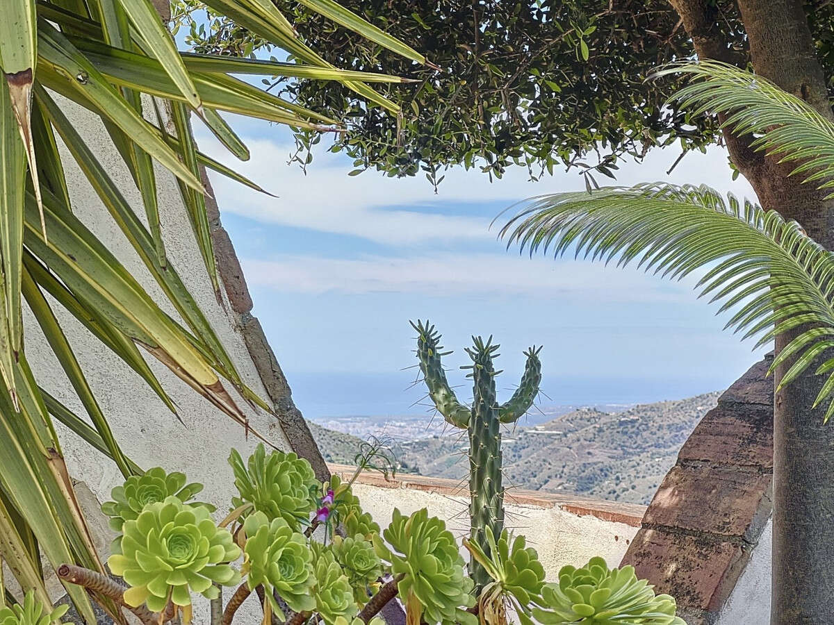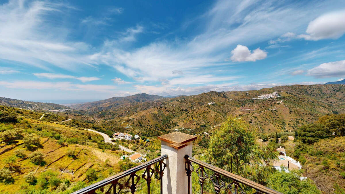 This charming Spanish country house in Sayalonga/Árchez, Málaga, blends traditional character with modern comfort all set against a backdrop of breathtaking views. The property offers a constructed area of 199 m2 and 148 m2 of living space spread over two floors, with three bedrooms and two bathrooms ideal for families or guests. Inside, rustic features dominate: exposed wooden beams under whitewashed ceilings add warmth and authenticity to every room. Terracotta tiles emphasize the Mediterranean style and create a harmonious overall aesthetic. A major highlight is the well-thought-out heating solution: a modern pellet stove in the hallway efficiently warms the entire house. Additionally, there's a cosy wood-burning stove in the living room and an infrared panel heater for extra comfort on cooler evenings. The bathrooms also feature electric infrared heaters to ensure a pleasant, warm atmosphere. Both the living room and bedrooms include built-in wardrobes that offer practical storage while blending seamlessly with the style. Plush furniture in warm red tones, decorative mirrors, colourful artworks, and personal collections give the space a relaxed, bohemian vibe. A striking archway connects the interior to one of the terraces and opens up to stunning views of the countryside. The kitchen is both charming and functional, with cream cabinets, granite countertops, modern appliances, and a patterned tile backsplash. A decorative extractor hood completes the picture. The two bathrooms are individually designed: one features a bathtub and artistic rustic tiles, while the other has a modern look with clean lines and contemporary fittings. Both complement the character of the house. The bedrooms reflect the Andalusian style, with wrought iron beds, wooden furniture, warm lighting, and the aforementioned built-in wardrobes that add comfort and order. Outside, several terraces offer spectacular views of the sea, rolling hills, and white villages. One of the terraces is covered and offers expansion potential ideal for one or two additional rooms. The outdoor area also includes a private pool, various seating areas, an outdoor kitchen, and a well-kept garden perfect for sociable evenings or quiet moments in nature. This villa combines timeless architecture with personal touches, thoughtful amenities, and spectacular views a true taste of Andalusian living. We are pleased to be able to present this dream property to you soon, either personally or via virtual viewing. Because this world is unique - just like our Axarquía. In Andalusia. On the Costa del Sol. Here, on the sunny side of life...