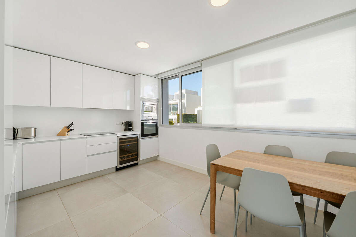 The top floor features a bright, spacious bedroom currently used as an office, a separate bathroom, and access to a vast rooftop terrace, an exceptional space for al fresco dining, lounging, or adding a private spa, all while enjoying sweeping golf and sea views.