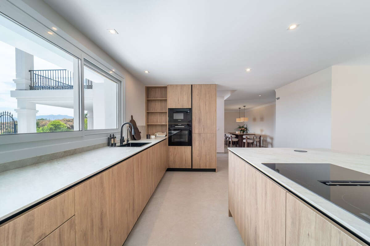 The villa features five spacious bedrooms and three elegant bathrooms – perfect for large families or as a generous holiday home. The bright open-plan living room seamlessly connects to the modern kitchen with a central island and inviting bar stools – the perfect place to gather and enjoy life.