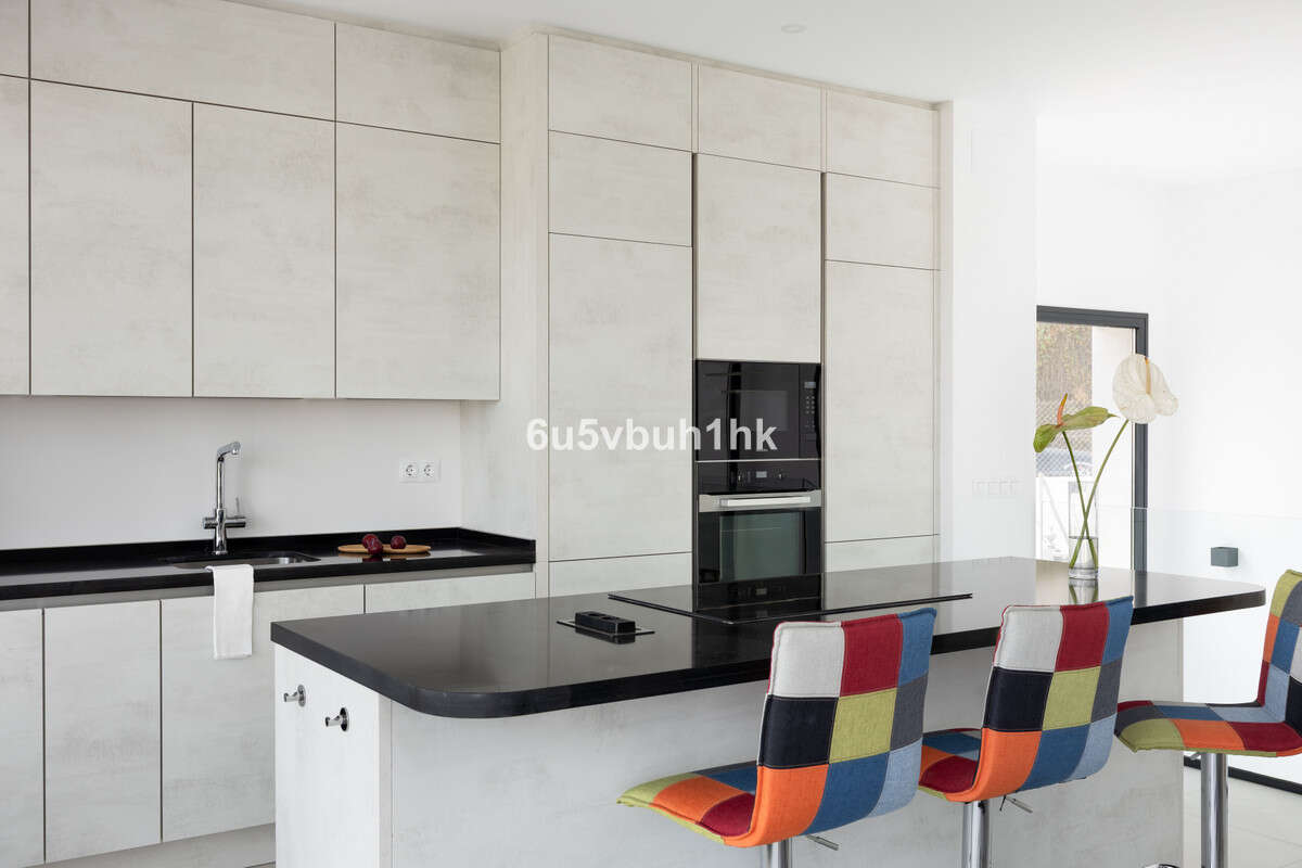 On the ground floor, you will find three spacious bedrooms, all with direct access to the terrace and pool area. The master bedroom features a luxurious en-suite bathroom and a generous walk-in closet. The upper floor impresses with an open-plan design, a state-of-the-art kitchen of the highest standard, and a bright living room. From here, you can access the large terrace, perfect for social gatherings with a dining area, lounge space, and barbecue, as well as partial sea views.