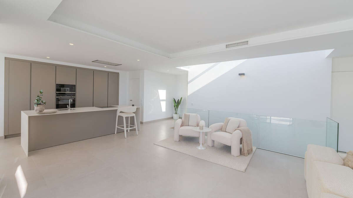 The main space combines a designer kitchen, dining room and living room in an open-plan concept that flows onto a west facing terrace. Here you can enjoy outdoor living on a spectacular, large terrace with a private swimming pool.