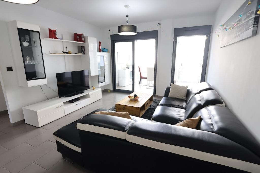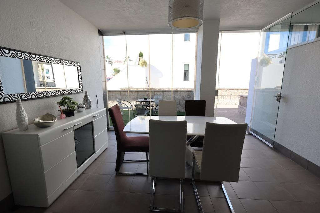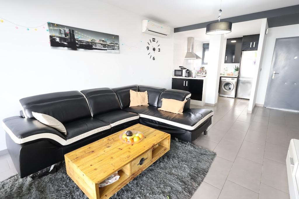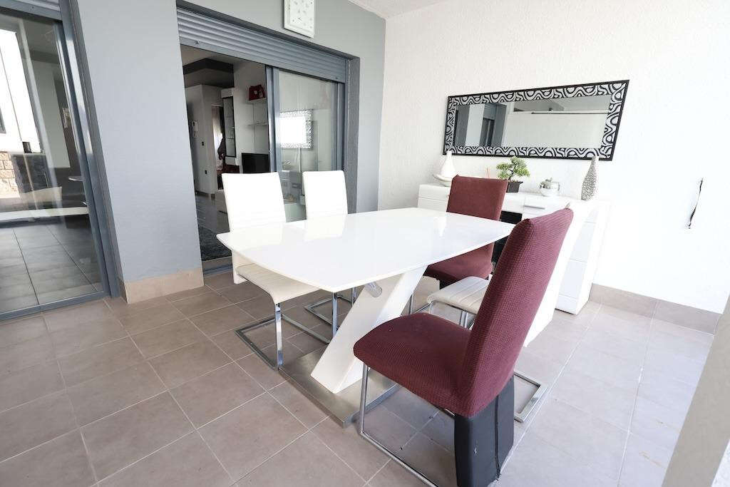 Ground-floor bungalow with two gardens: one measuring 13 m2 with direct access to the communal swimming pool area, and another of 6 m2 at the back of the property.. The home offers 77 m2 distributed into 2 bedrooms, 2 bathrooms, an open-plan kitchen connected to the living-dining area, and a glazed terrace.. . It is sold fully furnished and equipped with air conditioning. An outdoor parking space is included.. The residential complex features large green areas, a children's play area, and is located next to the Zenia Boulevard shopping centre.