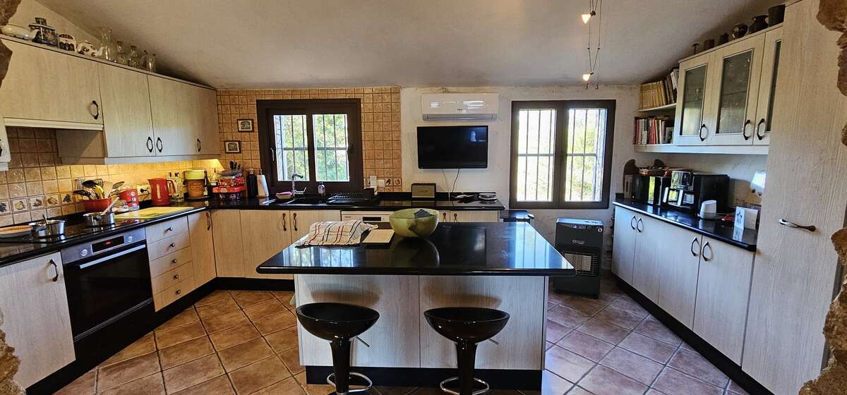Beautiful rustic country house with a pool in a quiet area not far from the village. The house has a very welcoming, homey feel, with stone walls and a living-dining room with a fireplace. It features a fully equipped kitchen with an island, three bedrooms, and two bathrooms. There is a storage room, a laundry room, air conditioning, and electric heating. Outside, on the terrace, there is a swimming pool with an outdoor shower and a summer kitchen with a barbecue. There is a parking area, and the property is fenced.