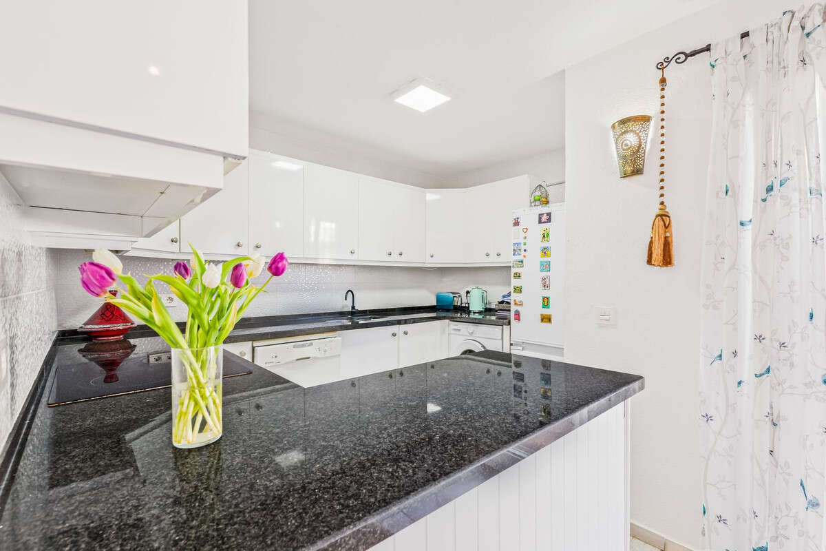 The open-plan kitchen flows seamlessly into a spacious living area, featuring a cozy fireplace and direct access to a large terrace—ideal for outdoor dining or entertaining. From here, the home extends into a generous private garden, perfect for enjoying the region's year-round sunshine.