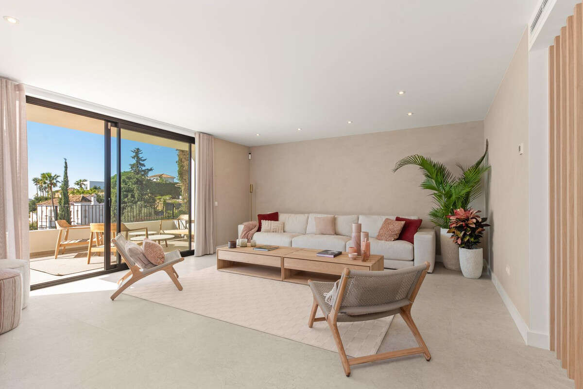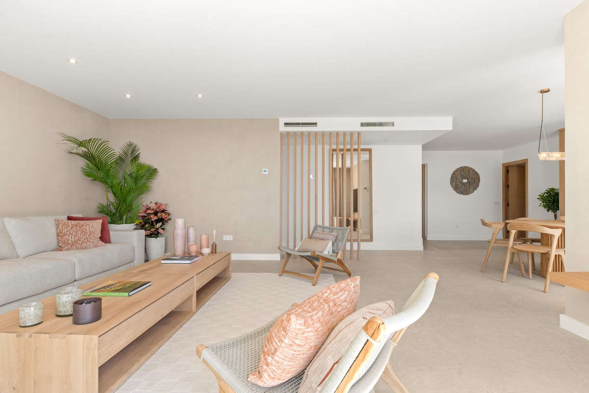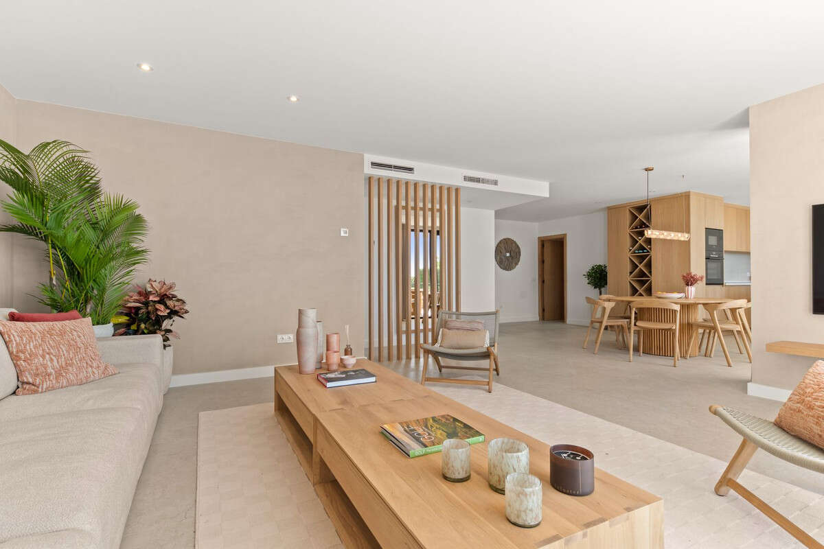 The open-plan living space combines understated luxury with seamless indoor-outdoor living, highlighted by premium finishes and expansive sliding doors leading directly onto the terrace and sea views.