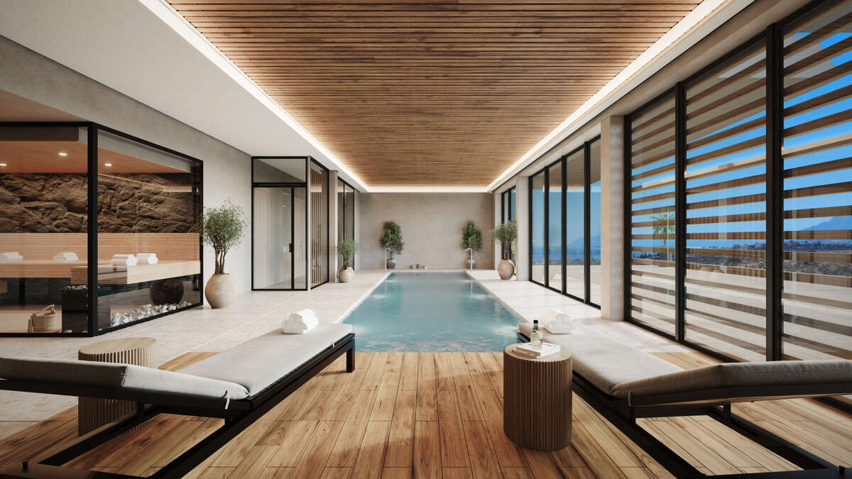 Residents benefit from a comprehensive wellness and leisure offering, including a heated semi-Olympic outdoor pool, heated indoor pool, fully equipped gym with yoga and Pilates studio, sauna, hammam, and hydrotherapy area with ice buckets. Outdoor facilities include five dedicated sports and wellness areas, multiple yoga and calisthenics zones, an outdoor bar with Balinese beds, and landscaped communal spaces. The development also features 24-hour security for peace of mind.