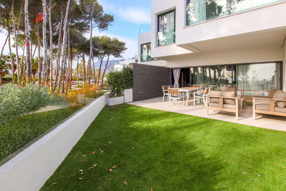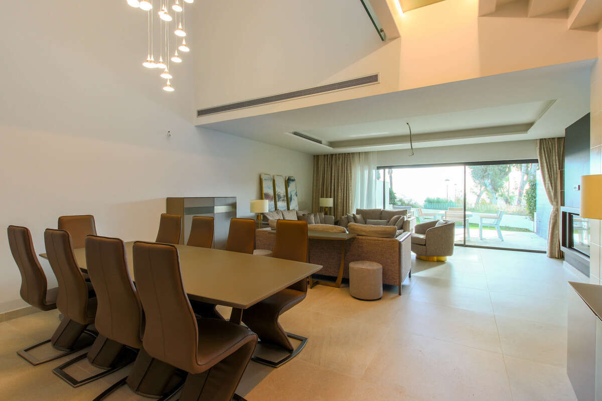 Modern and luxurious townhouse with 4 bedrooms brand new on the beachfront on the New Golden Mile of Estepona, being only twenty minutes from Puerto Banús and Marbella. The community has beautiful tropical gardens, swimming area, with a fifty-meter Olympic pool, and a spa circuit with sauna and Turkish bath. The house has a private roof terrace with fantastic sea views, jacuzzi and barbecue area, large living room with fireplace, fully equipped kitchen. It is equipped with underfloor heating, air conditioning hot / cold, security shutters and double glazing.