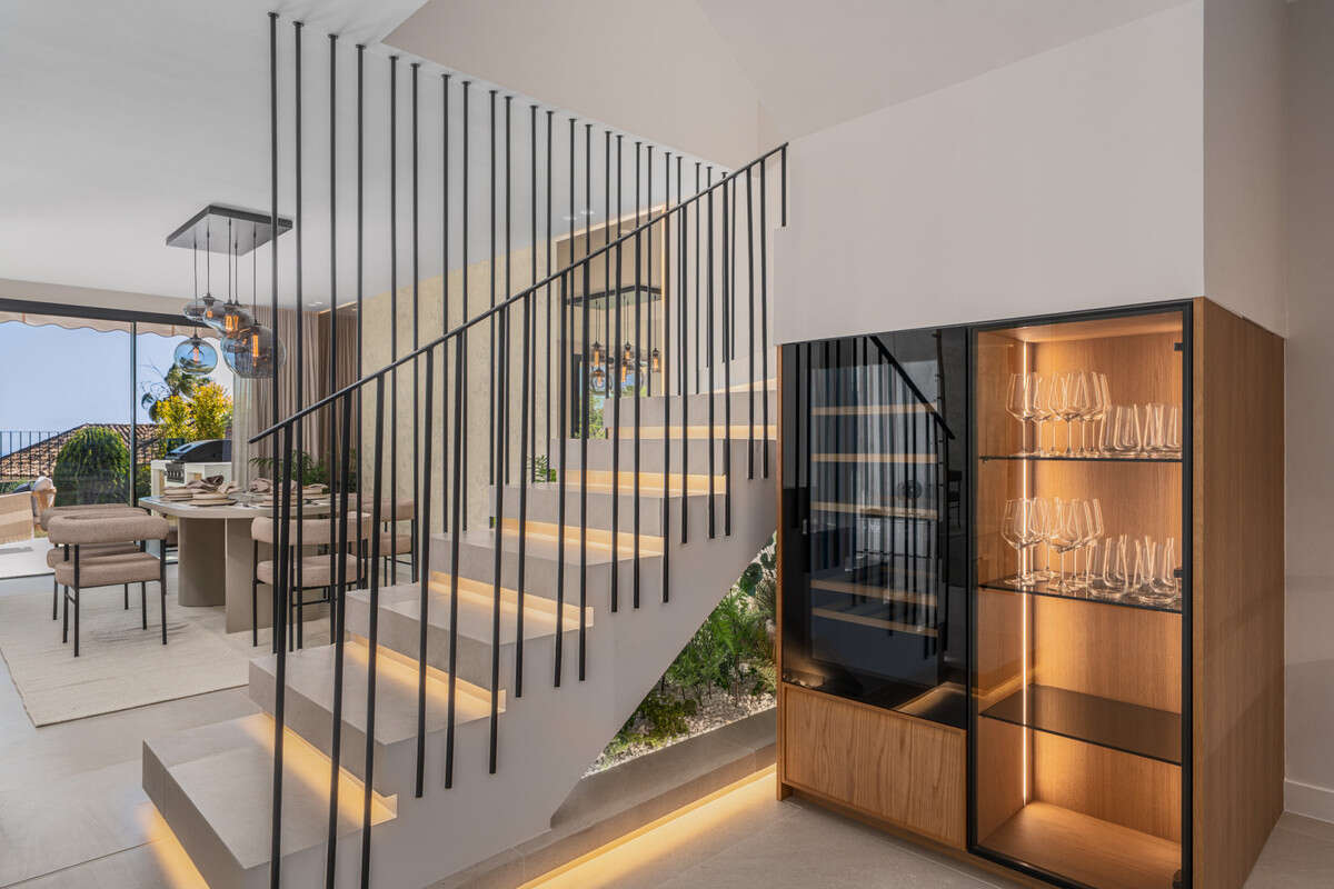 Crowning the property is the rooftop solarium. From this elevated space, residents can enjoy panoramic views of the Mediterranean and the iconic La Concha mountain. Outfitted with a built-in lounge, bioethanol fireplace, bar area, outdoor shower, and sunbeds, this space invites year-round use and relaxation.