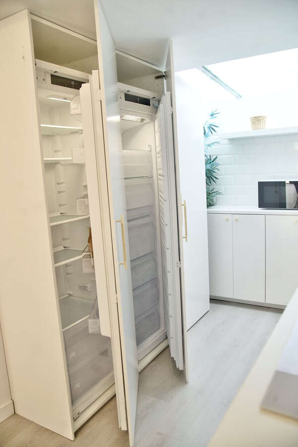 Upstairs, the home features three bedrooms, including a primary suite with access to two private terraces, and two bathrooms, all flooded with natural light.