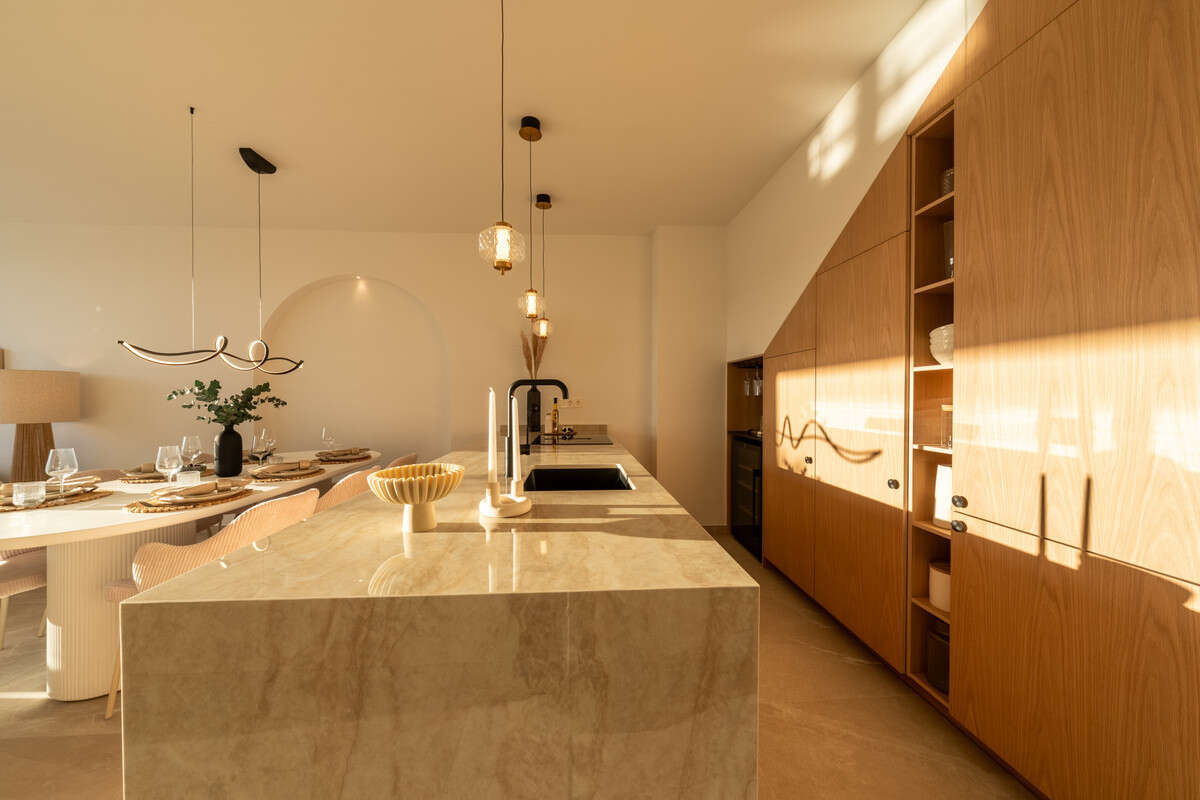 Designed with a modern Mediterranean aesthetic, the home exudes warmth and elegance. The open-plan living space features a bespoke kitchen with natural wood accents and Dekton finishes, flowing seamlessly into the dining and lounge areas. Expansive glass doors open to a private terrace and landscaped garden — perfect for relaxed al-fresco living.