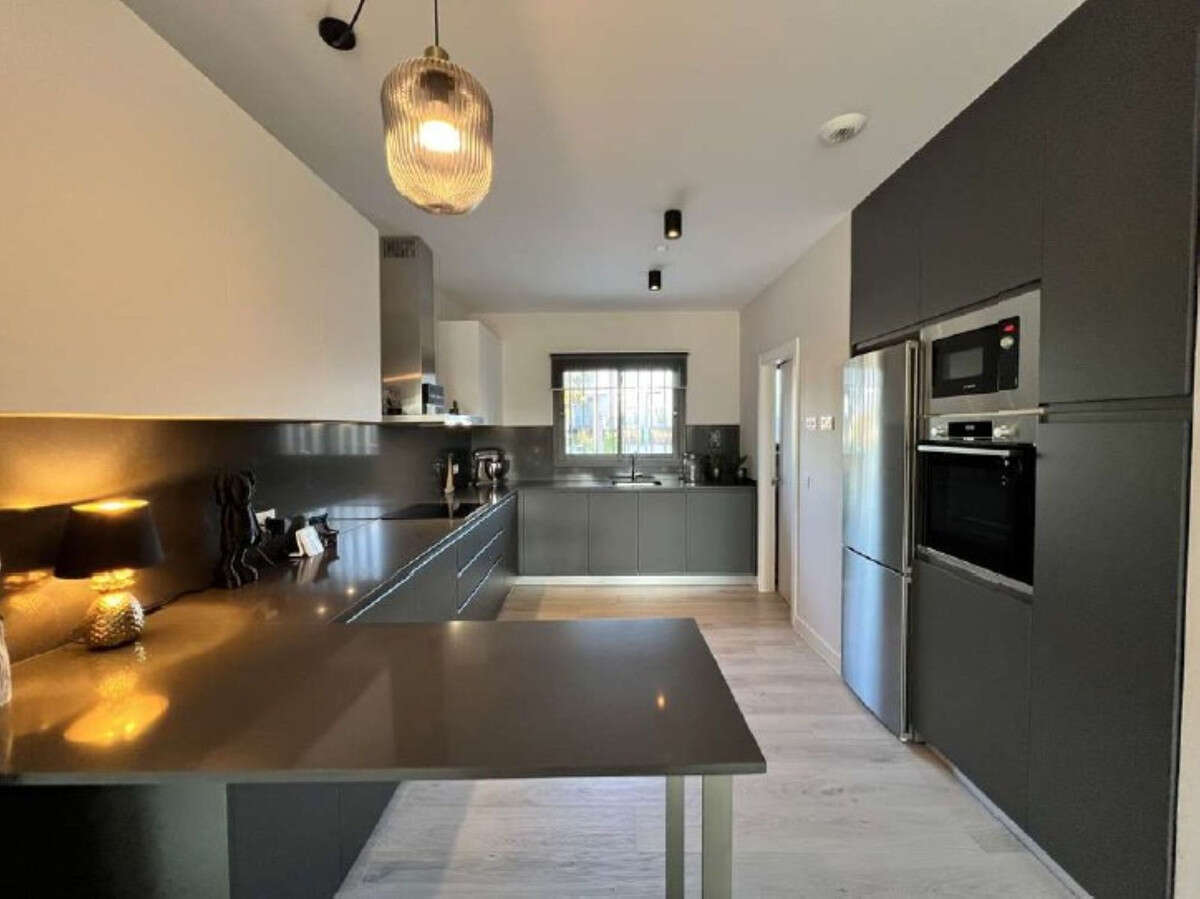 The ground floor boasts a bright and airy living room that opens up to a large west-facing terrace and private garden, perfect for outdoor gatherings, with stunning views of the golf course. The sleek, modern kitchen is fully equipped with high-end appliances. Also on this level, you'll find a convenient guest WC and a useful storage room. Upstairs, the master bedroom comes with an en-suite bathroom and a private glazed balcony overlooking the golf course. Two additional well-sized bedrooms share a bathroom with a bathtub, and have access to a balcony with views of the community pool.