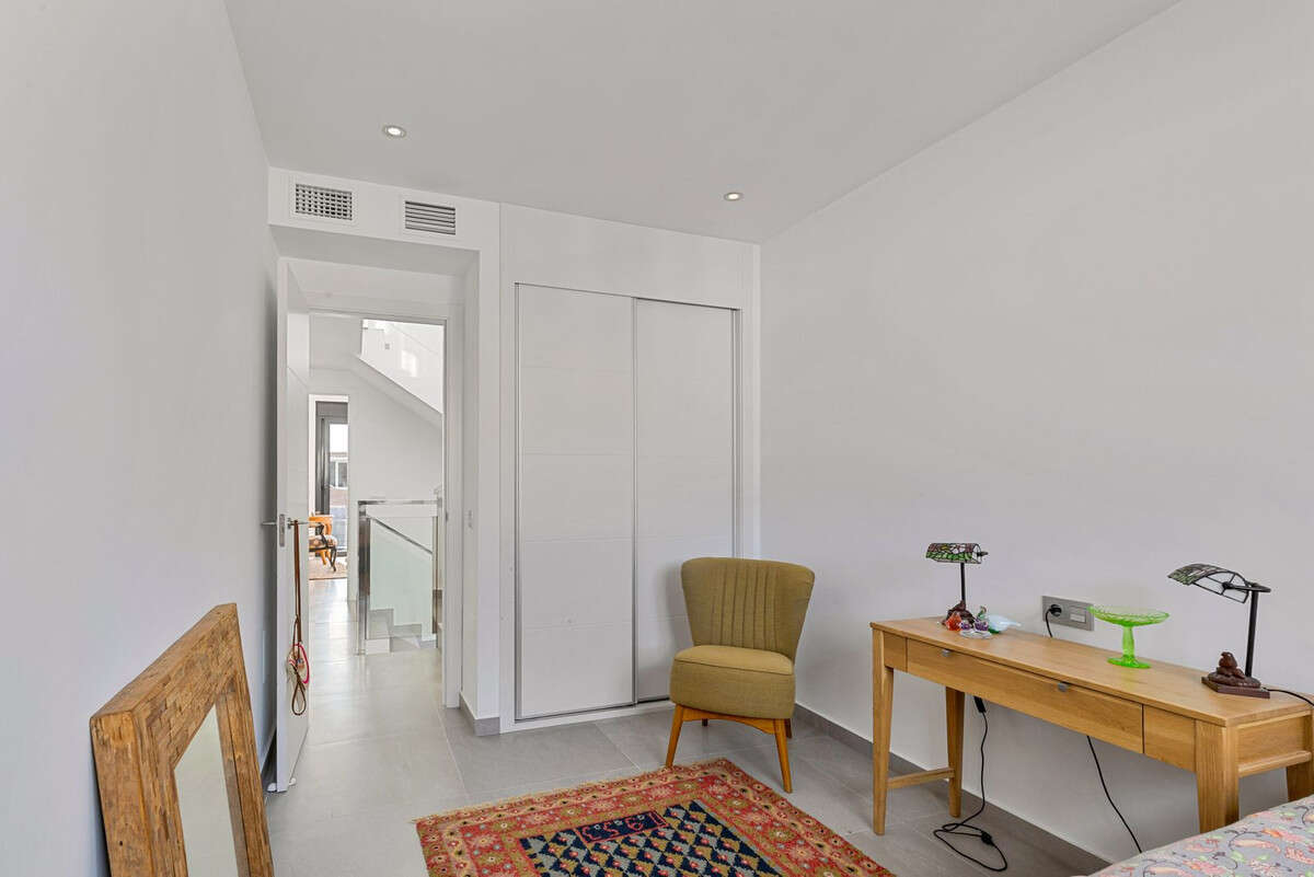 On the main floor, you will find a stylish, fully equipped modern kitchen with direct access to a west-facing terrace, ideal for outdoor dining. The spacious and bright living-dining area features large floor-to-ceiling windows opening onto a private garden with direct access to the communal pool. This level also includes a separate laundry room and a guest toilet.