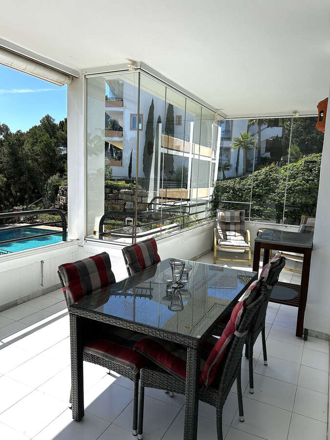 Entering the apartment, you are welcomed by a large lounge with dining area and direct access to the very spacious terrace with glass curtains, giving you use all year round.