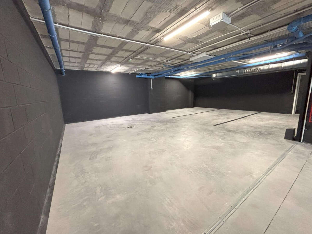 Private garage with motorized door, 3 oversized parking spaces, and storage room.
