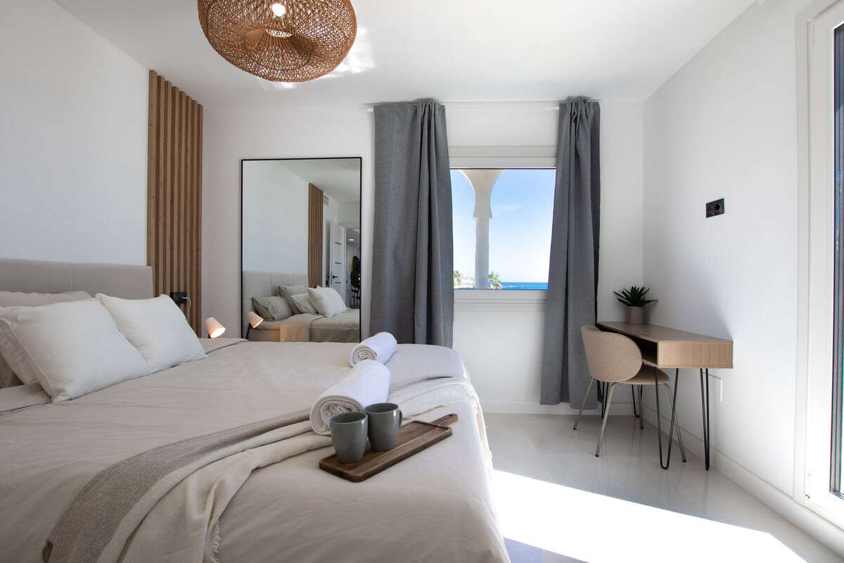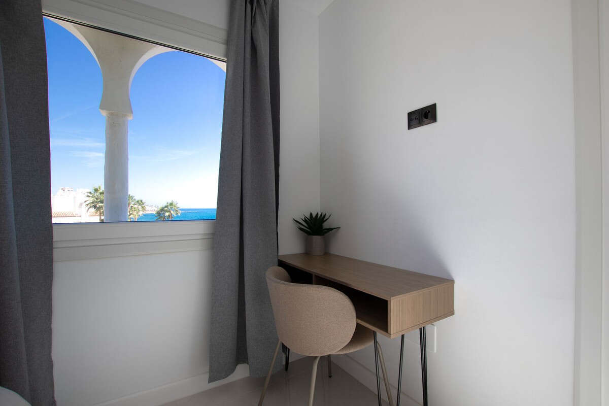 The apartment is a corner penthouse on the beachfront in Calahonda, Mijas Costa, province of Málaga. Completely renovated, without leaving a single detail to chance, the apartment has a large open kitchen, more than 4 meters long and with a large island. All appliances are new, there is a washing machine, dryer, dishwasher, refrigerator, induction hob, microwave, toaster, blender, coffee maker, etc. Fully stocked with a large selection of plates, bowls, glasses, mugs, etc. The kitchen has a lot of light since it has 2 windows, both with views of the sea and the beach. The living room is large and square, with an L-shaped sofa bed, smart TV, sea views from many angles and a door leading to the private terrace. On the terrace of more than 60 m2 there is a covered part, with a large table and 6 chairs, hot and cold air conditioning (split), and the other part of the terrace is without a roof, with a barbecue, sun loungers. and beautiful views of the sea, facing east, south and west.