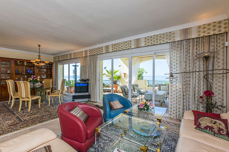 Amazing front line beach penthouse in Hacienda Playa Phase 2 in Elviria, East Marbella. This stunning penthouse offers the most incredible sea views and spectacular sunsets every evening. The apartment offers on one level three bedrooms, two bathrooms, guest toilet, large and bright kitchen with separate utility room, very large living room and dining room with access to sunny and partly covered and glazed terrace with southwest orientation. There is a roof terrace boasting breathtaking views of the coast and lots of privacy. Gated complex with gardens and pool. Sold fully furnished, new kitchen, marble floors, new air conditioning hot and cold, underfloor heating in the master bathroom and including as well storage room and underground parking space. Lift. Within walking distance to all local amenities.