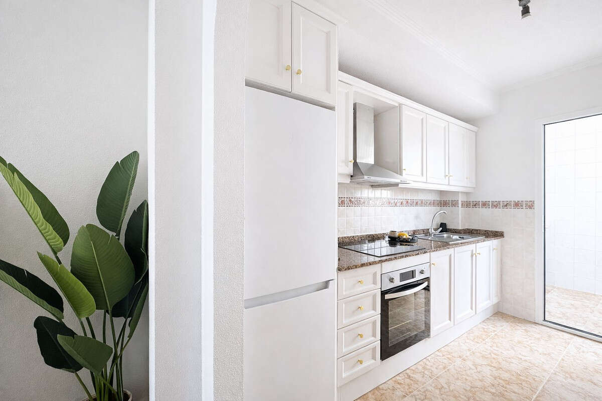 Inside, the home features two spacious bedrooms with built-in wardrobes and a fully renovated bathroom finished with high-quality materials. The bright living area flows naturally into a glazed balcony, which extends the living space and offers calming views over the communal pool, lush gardens, and the sea in the distance. The modern kitchen is fully equipped with new appliances, including an induction hob and oven, and is complemented by a practical patio area with integrated laundry space.