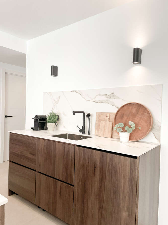 The custom kitchen features a nicely contoured island and top-of-the-line Bertazzoni appliances. The bathroom walls and outdoor areas are covered with 60x60 beige porcelain tiles, which are used throughout the design to provide coherence. The two bathrooms' sleek black features and skylights give them the ideal modern touch, and you can truly live comfortably in the sun here.