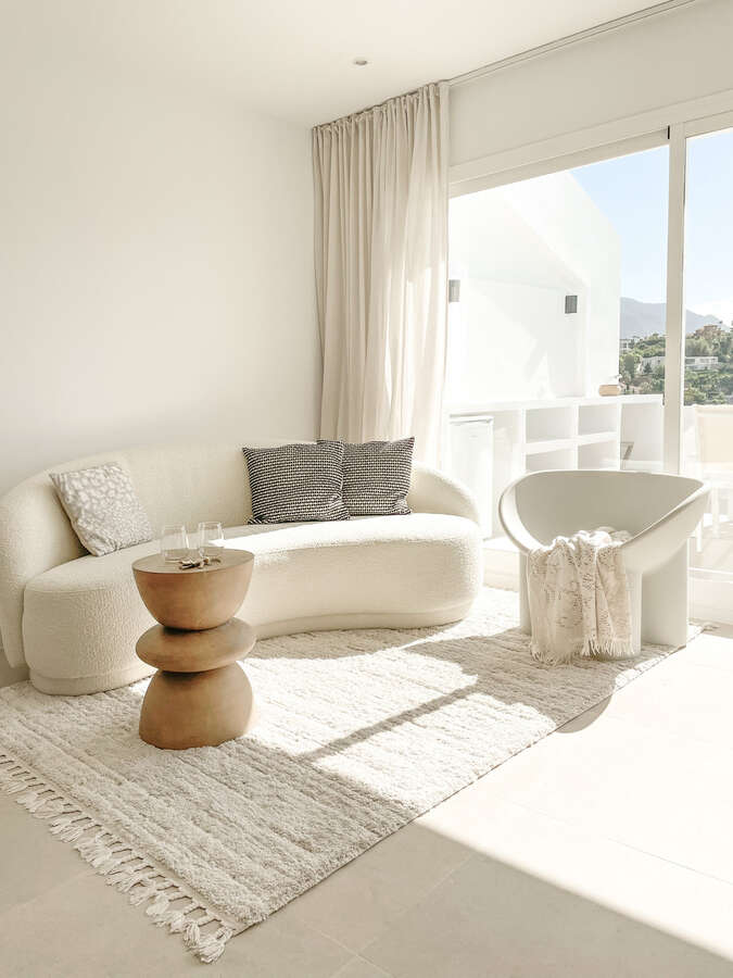 The custom kitchen features a nicely contoured island and top-of-the-line Bertazzoni appliances. The bathroom walls and outdoor areas are covered with 60x60 beige porcelain tiles, which are used throughout the design to provide coherence. The two bathrooms' sleek black features and skylights give them the ideal modern touch, and you can truly live comfortably in the sun here.