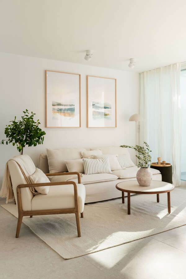 As you step inside, you are greeted by an open, light-filled space where the living room and terrace flow seamlessly together, thanks to bespoke floor-to-ceiling windows from Cortizo. From here, enjoy breathtaking panoramic views of the Mediterranean Sea accompanied by the peaceful sound of birdsong.
