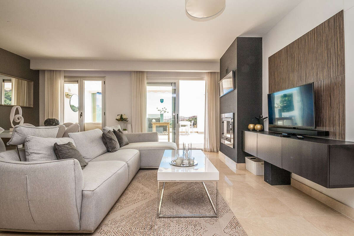 A highlight of the home is the large terrace with breathtaking panoramic views and an added conservatory with glass curtains, to create a versatile all-season living space. Additional features include an elevator bringing you directly to your front door, private solar panels with the added benefit of low electricity consumption, a private parking space and inclusion in a gated community with landscaped communal gardens and several outdoor swimming pools.
