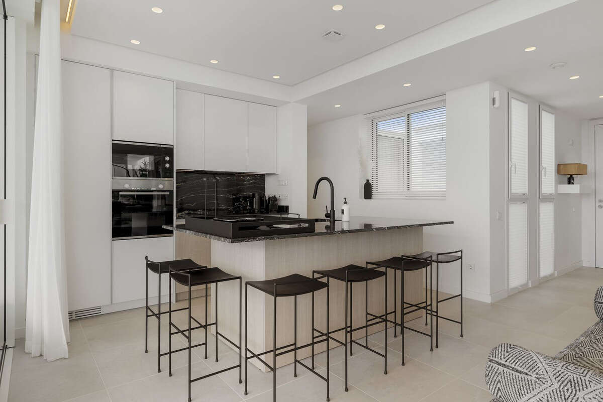 Bathed in natural light, this sophisticated home boasts a spacious sun-drenched terrace with a sought-after southwest orientation, offering uninterrupted views of both the Mediterranean Sea and the Sierra de las Nieves mountains. Floor-to-ceiling sliding glass doors connect the open-plan living area and the master bedroom directly to the terrace, creating a seamless indoor-outdoor flow.