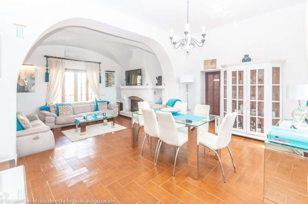Ground floor: Living room with fireplace with access to an interior patio. In the living room there is also a dining area. Fully equipped kitchen with access to the interior patio and a second dining area with fireplace. On one side of the living room there is an office and on the other side the rest area with 3 double bedrooms and a bathroom. The 3 bedrooms have direct access to the garden.