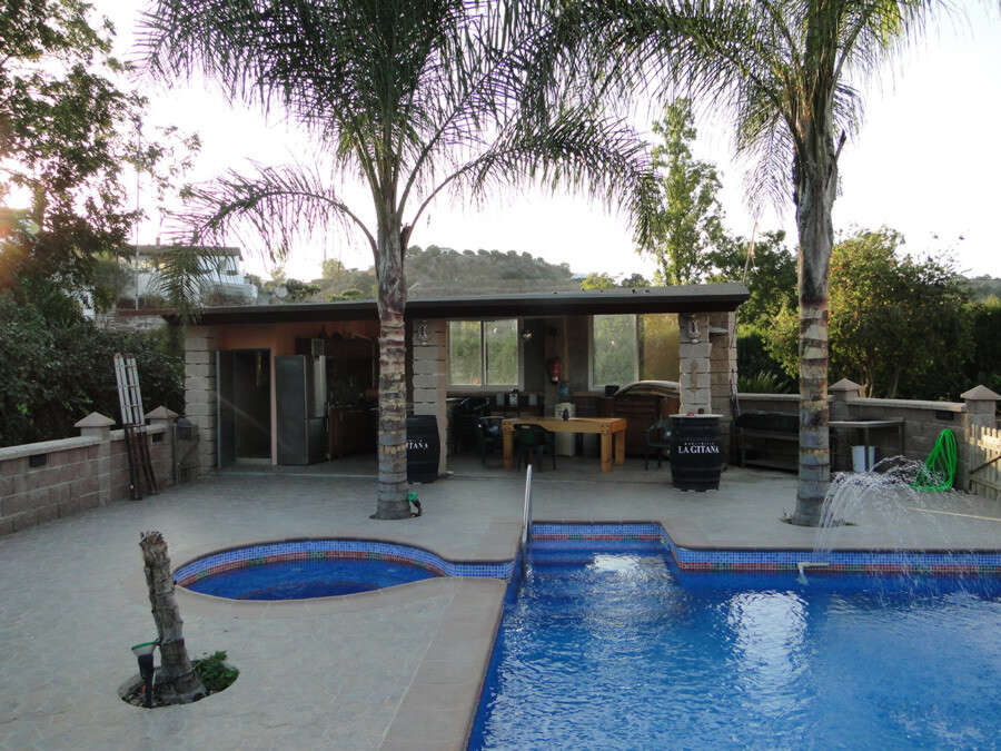 The fully fenced plot is designed for outdoor living, featuring a landscaped garden, private swimming pool, summer kitchen with barbecue, and an exterior bathroom, ideal for entertaining. Practical extras include multiple storage rooms, two wells, and irrigation water.