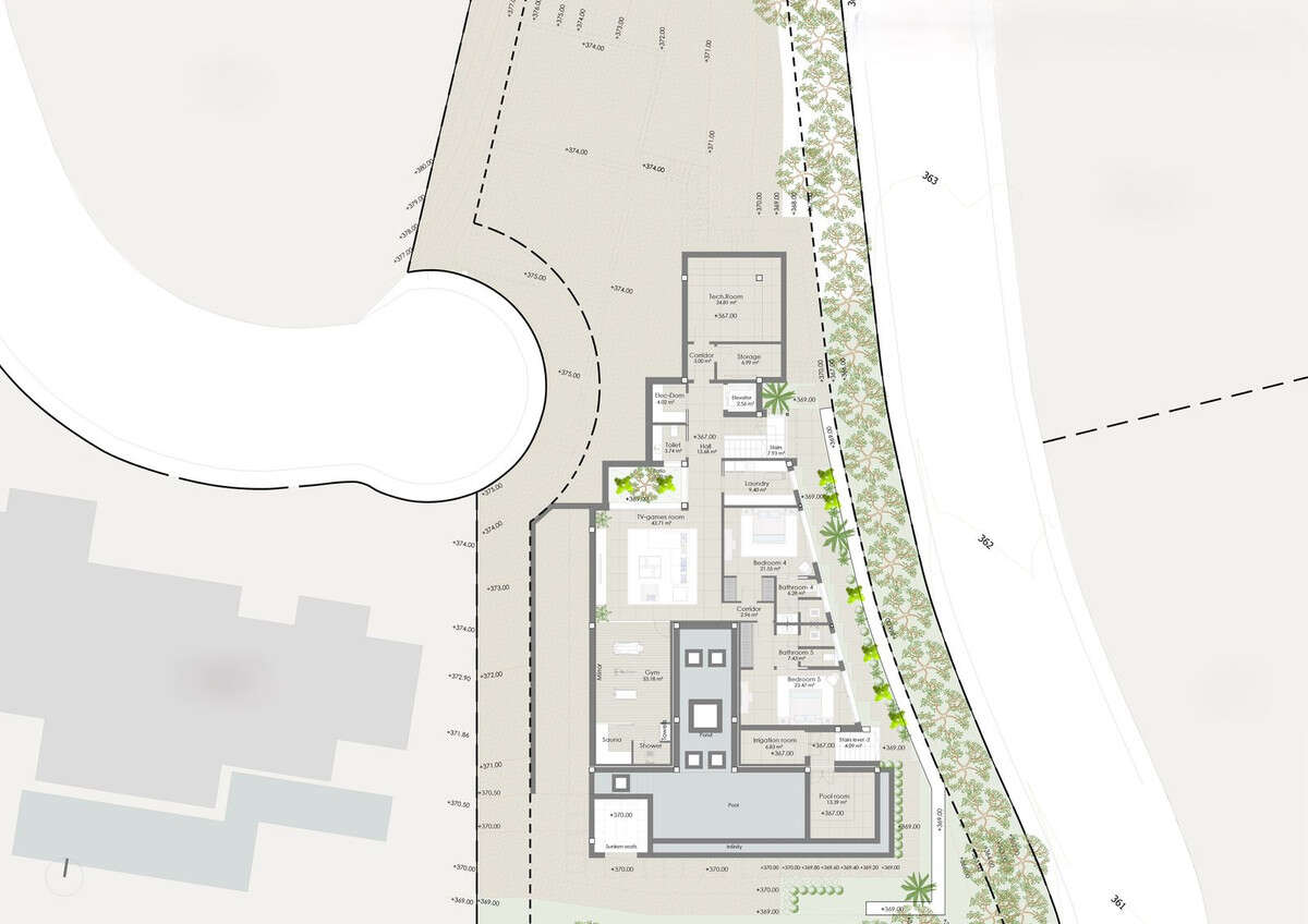 The project is designed with five spacious bedrooms and seven opulent bathrooms across three meticulously planned levels. Quality is paramount, with high-grade materials used throughout the property. This exquisite villa offers an array of high-end amenities, including a full gym, private cinema, game room, wine cellar, elevator, and sauna. Every detail has been thought of to provide you with the ultimate luxury living experience.
