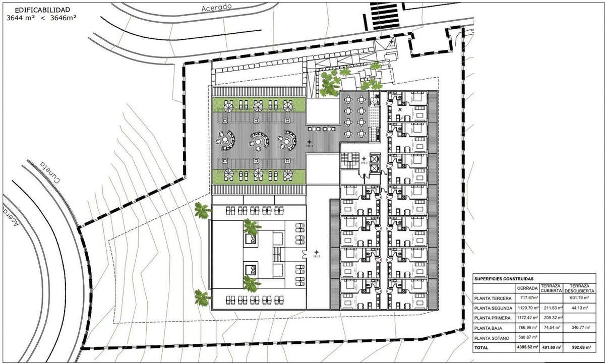 This is a plot designated for Equipment/Commercial use, with a total surface area of m² and 3,650 m² of buildable space, with a viable project for the construction of up to 51 tourist apartments.