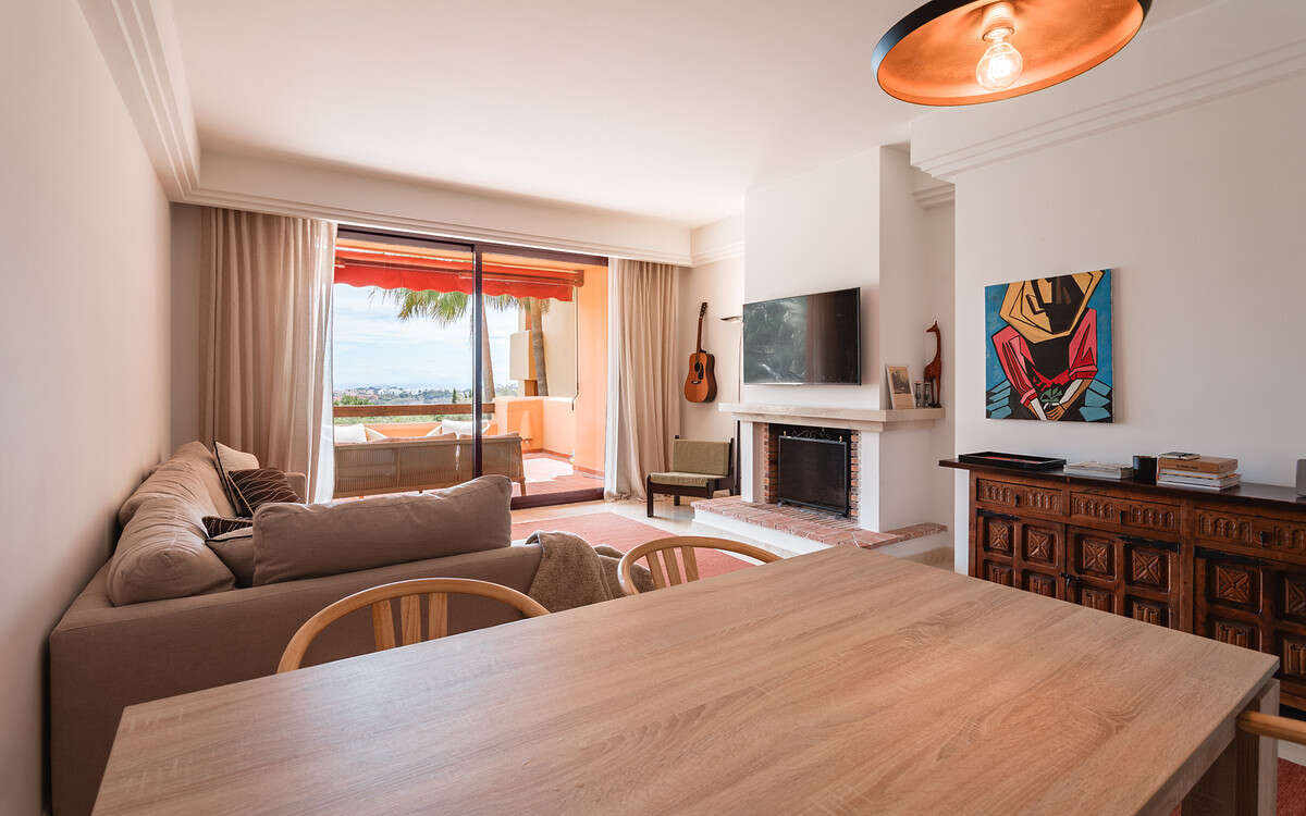 Bañado por la luz natural, el apartamento cuenta con un amplio salón-comedor con chimenea funcional, que se abre a una terraza parcialmente cubierta con vistas panorámicas al Mediterráneo, Gibraltar y África. La cocina independiente, totalmente equipada, ofrece una gran superficie de trabajo y armarios espaciosos y bien distribuidos. Dispone de dos amplios dormitorios dobles en suite con armarios empotrados, siendo el principal con acceso directo a la terraza, además de un aseo de invitados que aporta comodidad para las visitas.