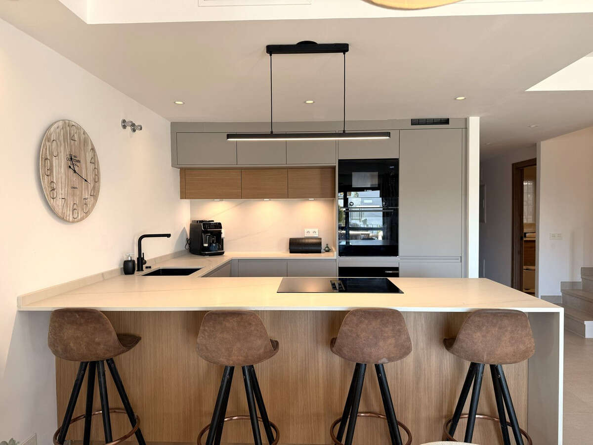 En el corazón de la casa se encuentra la impresionante cocina abierta, un espacio realmente impactante, diseñado tanto para el día a día como para el entretenimiento sofisticado. Con elegantes muebles y equipada con electrodomésticos Bosch de alta gama, como horno, microondas, placa de inducción y una impresionante vinoteca bitemperatura, la cocina combina funcionalidad y lujo. La innovadora placa de recirculación permite que la zona de cocción se ubique perfectamente en la península, lo que facilita la interacción entre la cocina, el comedor y el salón.