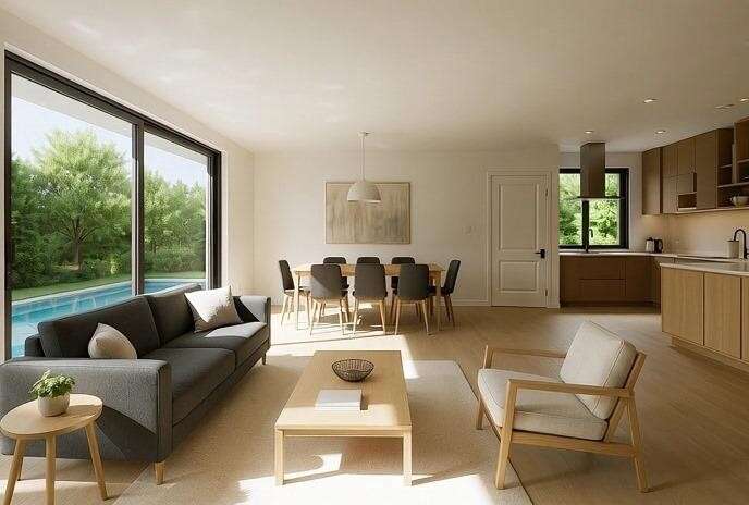 -Espacioso salón-comedor con grandes ventanales que se abren hacia la terraza y la piscina privada.