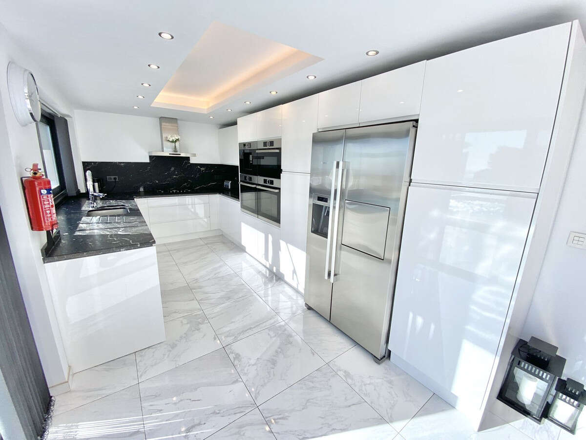 Esta impresionante villa de 5 dormitorios y 5 baños en venta en Benalmádena Pueblo también ofrece una zona independiente, actualmente utilizada como apartamento de 1 dormitorio, y ha sido completamente reformada con materiales de alta calidad. La villa ofrece un amplio salón-comedor con una moderna moldura, iluminación oculta y focos. Esta encantadora sala de estar ofrece abundante luz natural gracias a sus tres grandes puertas correderas que dan a la zona de entretenimiento y a la piscina. Moderna cocina abierta, blanca de alto brillo, equipada con armarios bajos y altos que incorporan electrodomésticos Bosch de lujo, incluyendo dos hornos, microondas y cafetera. Encimera de lujo de granito oscuro y salpicaderos con fregadero empotrado, gran placa de gas Bosch y campana extractora. Ventana con vistas a la piscina y al mar, con una moderna moldura con iluminación oculta y focos. Aseo y escaleras al rellano de la primera planta.