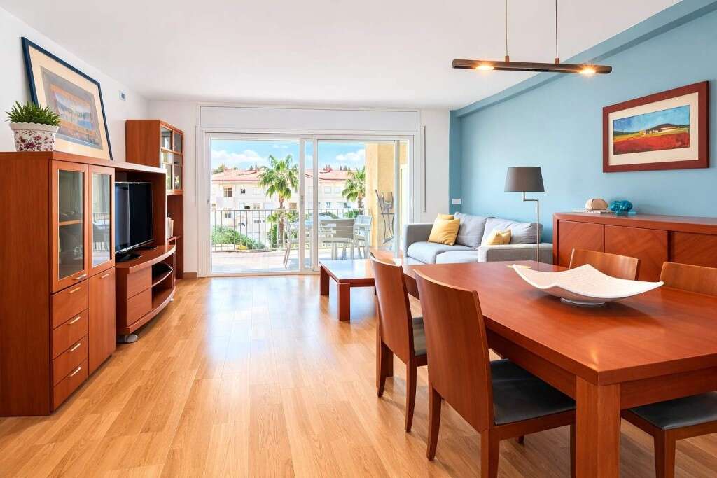 Vive en Can Pei, una de las zonas más tranquilas y valoradas de Sitges, en una comunidad con amplios jardines, gran piscina y palmeras, perfecta para disfrutar todo el año.Este piso destaca por su luminosidad, amplitud y excelente distribución, listo para entrar a vivir.El salón comedor es amplio y muy luminoso, con salida a una gran terraza con vistas abiertas al jardín y la piscina, ideal para relajarse o disfrutar con familia y amigos.La cocina es espaciosa y equipada, y dispone de lavadero independiente con espacio para lavadora, secadora y almacenamiento, con salida a una práctica terraza de servicio.DistribuciónSuite principal con armarios empotrados y baño completoHabitación dobleHabitación individualSegundo baño completo con duchaToda la vivienda mantiene una continuidad de suelos de parqué, incluyendo parqué hidrófugo en cocina, baños y zona de aguas, que aporta calidez y resistencia a la humedad.Extras que marcan la diferencia✔ Calefacción de gas✔ Plaza de parking incluida✔ Gran terraza con vistas abiertas✔ Comunidad con jardines y gran piscina✔ Ascensor y accesos adaptadosLa ubicación es excelente: cerca del campo de golf, colegios, instituto, supermercado y club deportivo privado en la misma finca, a 10 minutos andando de la playa y 20 minutos del centro de Sitges.Honorarios de agencia a cargo del propietario. El comprador no paga comisión.Una vivienda ideal para vivir todo el año o disfrutar de Sitges con tranquilidad y todos los servicios cerca.